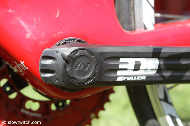 Rotor showed the new bottom bracket spindle based INpower power meter. Hides most of the goods inside the bottom bracket and thus looks very inconspicuous. Current Rotor crank users can thus get power with only left crank arm purchases and that starts at $779 for the 3D 30 and goes up to $839 for the 3D plus. That also know allows Rotor Flow users to run power.
