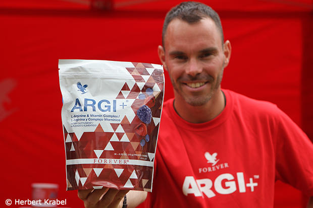 The Argi+ stand was one of the first booths to be set up, a full day early. Argi+ support triathletes Stefan Schmid, Kristin Möller and Lukas Krämer.
