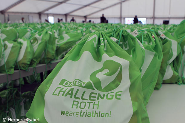 A sea of green Datev Challenge Roth bags is waiting to be picked up by athletes over the next days.