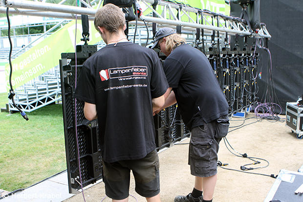 In the finish arena a crew was working hard to set up what will be a 15×12 ft big screen.