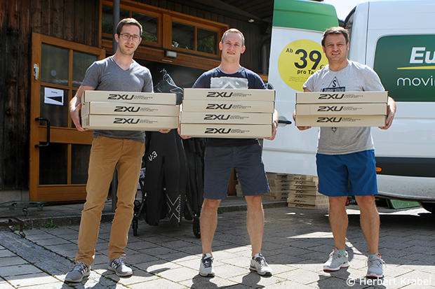 Björn, Lasse and Markus from 2XU Germany are not delivering pizzas here, they are setting up to sell a lot of wetsuits here in Roth.