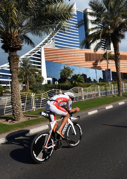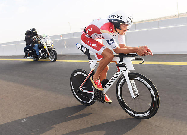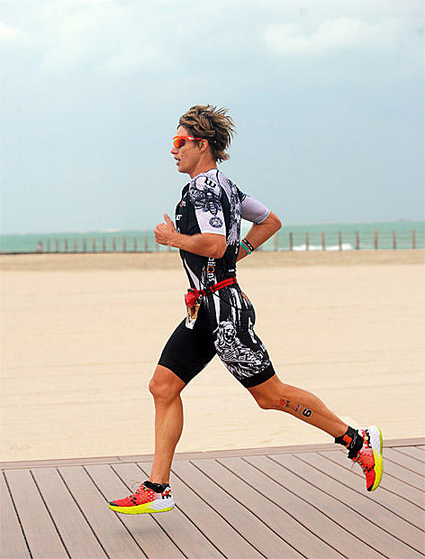 Frodeno charges past the Jumeirah Beach Hotel a mile from T2