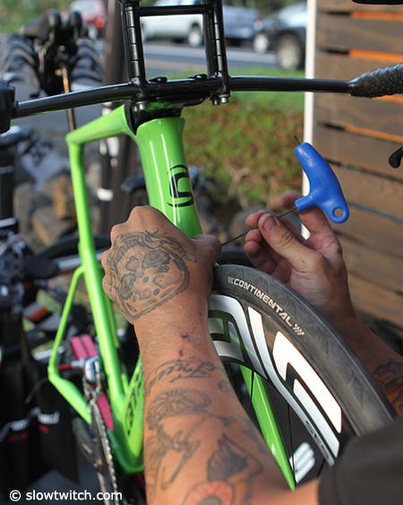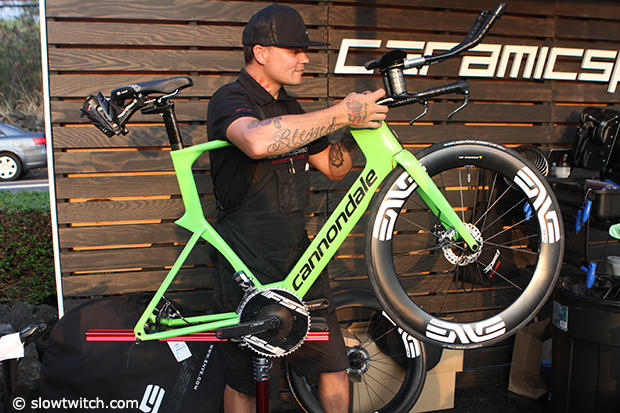 CeramicSpeed mechanic Jeff Yingling was working on the the new Cannondale of Andy Potts and we noticed the disc brake and integrated front end.