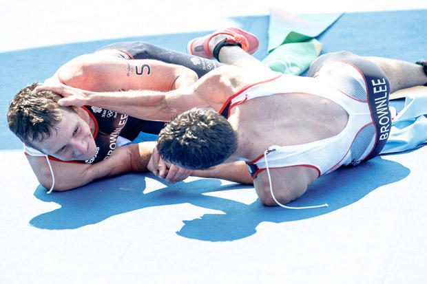 Alistair Brownlee and brother Jonny congratulate one another after 1-2 finish at Rio – photo by Wagner Araujo