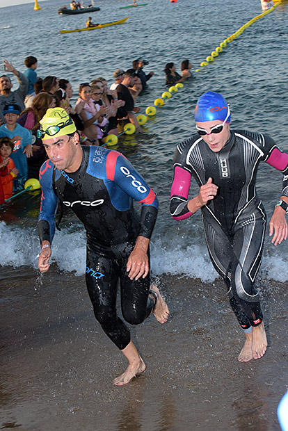 Two loop swim requires contestants to take a quick run on the playa and dive back for the final lap.