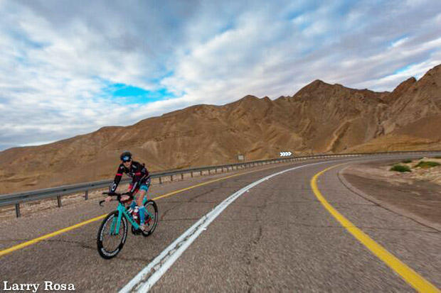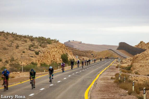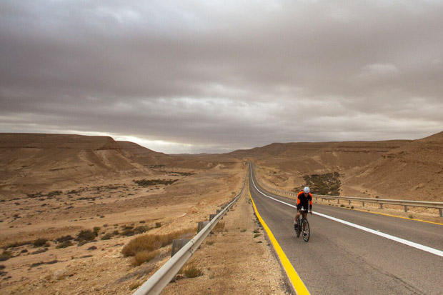 Elite rider charging on the desert plateau 2,700 feet above the Red Sea on the Israman bike course.