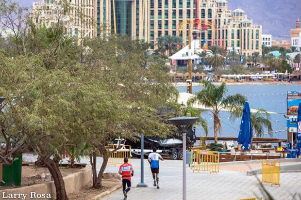 Age grouper runs past outdoor cafes and shops on the marathon run course in downtown Eilat.