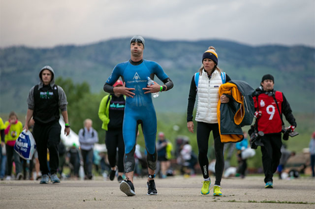 Tim O’Donnell stretches his Aqua Sphere wetsuit on the way to the start. He swam 49:46 – men's fastest split – but 1:03 slower than top woman Lauren Brandon.