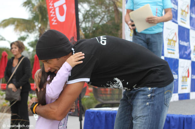 Oscar Galindez hugs 6-year old Andrea Anderson who gave him the trophy.