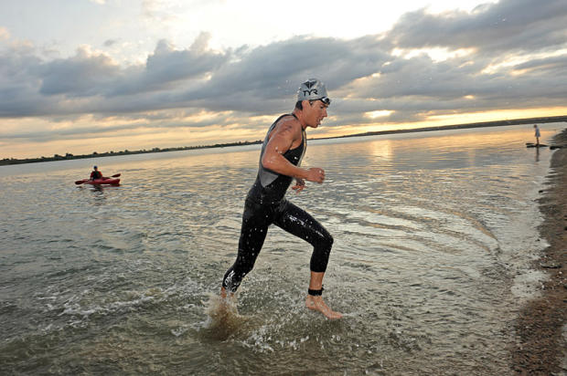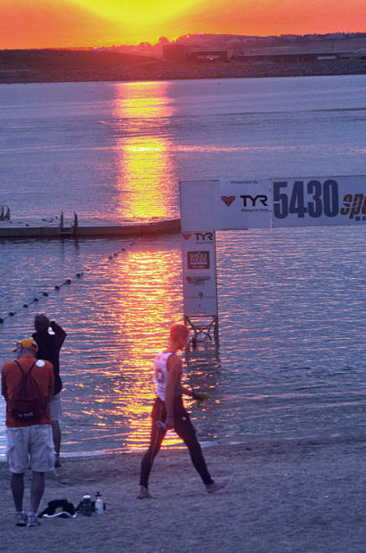 Defending champion Simon Thompson exits the swim, then got discouraged with a drafting stand down penalty.