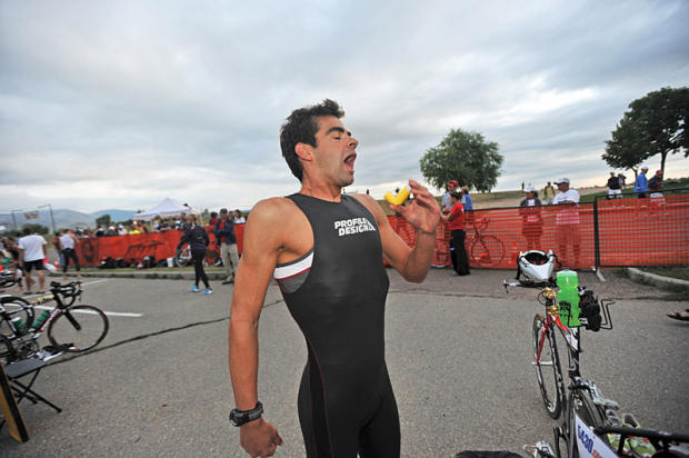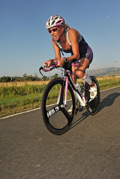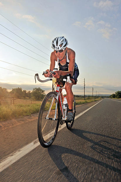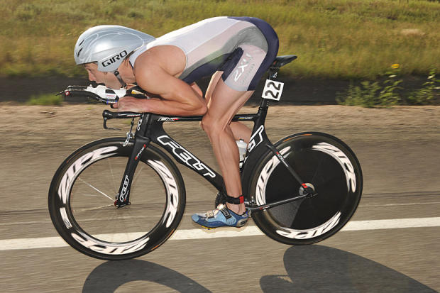 David Thompson surrendered his 2007 course record to O’Donnell, but his 2:02 bike split mark stood. Here, Thompson flies in an extreme aero position on his way to 4th place.