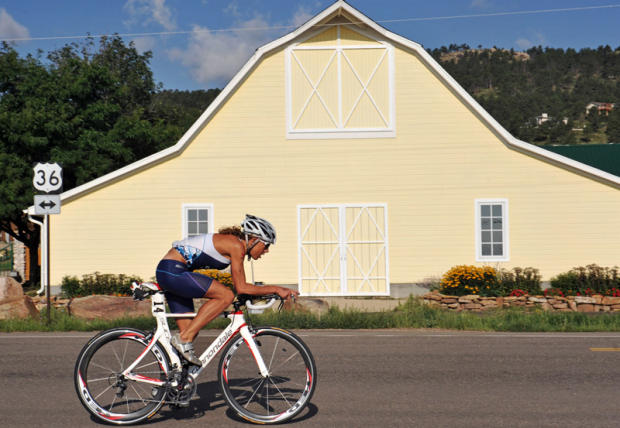Chrissie Wellington bikes past the lansdmark yellow barn on state highway 36 at Nelson Road.