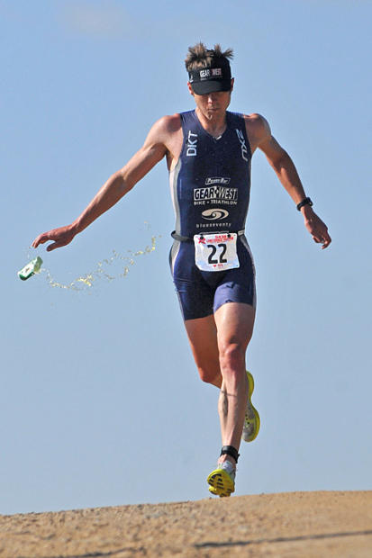 David Thompson pushed hard but after a 2008 hernia still hasn’t quite returned to his 2007 form. Here he hydrates on his way to a 1:19:47 run and 4th place.