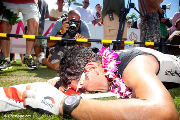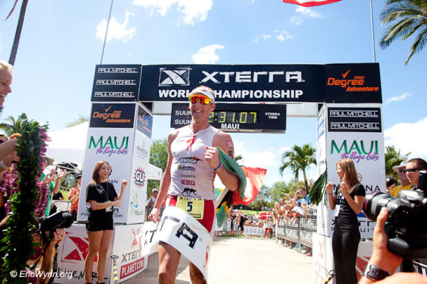 A very happy Conrad Stoltz crosses the line with 5 minutes to spare and his 4th XTERRA World Championship title.