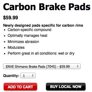 A lot of retailers in the bike biz rely on an outfit called Smart Etailing. This company presents website and ecommerce solutions to local bike shops, and you might think this oxymoronic, however, I went to buy a set of carbon brake shoes from the CycleOps website, and what I found is pictured adjacent. I can either buy this from CycleOps, or I can buy it at any of a number of local shops. If I do choose this avenue, I’m instructed to purchase the item on the local retailer’s ecommerce site, and then pick up the item will-call. This opens up a world of options, which we’ll discuss in a further installment.