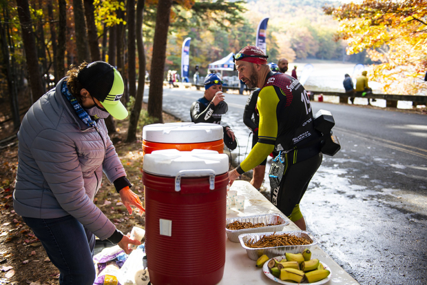 The main aid station at the lake offered hot broth in addition to Gatorade, water, SIS gels, apple sauce, bananas, pretzels and Haribo gummy peaches and sour cola gummies. But it was the hot broth that was a popular big hit.
