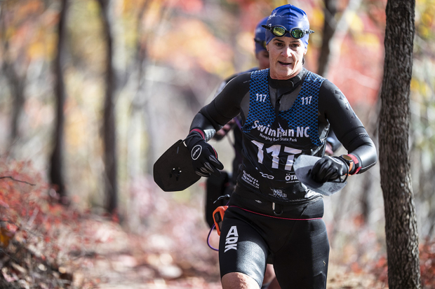 The 5th annual SwimRun NC was pushed to a later date this year and very cold water temperatures made this hard race even more challenging. Just 2 weeks earlier on the original race date of October 24th the water in the lake was still in the mid 60s and in the river just under 60 degrees. But with a cold front coming though the last few days before November 7 the water temperature in the lake had dropped to 52 degrees and in the river to 47 degrees. Luckily though the air temperature climbed steadily to pleasant numbers with a sunny blue sky overhead. The competition up front in every division was fierce and a nice prize purse and ÖtillÖ merit points had attracted some incredible talent – led by Andrew Starykowicz and Jarrod Shoemaker in the male division. But a victory was not a given for them and there was truly no true contender in any of the 3 divisions racing on that technical mountainous 16 mile running course with 2,700 feet of elevation gain and drop. The run distance however was split into 10 runs and the 2 miles of swimming was split into 9 very cold swims.