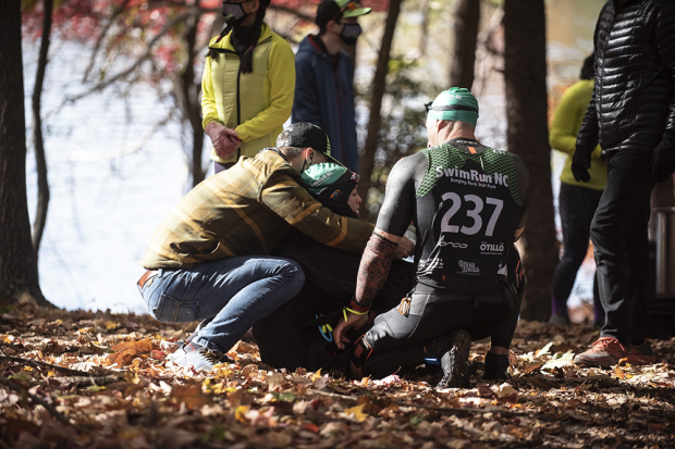 The very cold water put an end to the race for quite a few teams. Here Laura Bergman gets warmed by a volunteer while her partner Chris Ohlson looks on concerned. They ended up not finishing the race, but she is fine and wants to return in 2022.