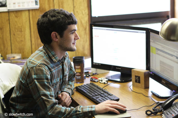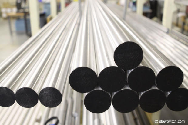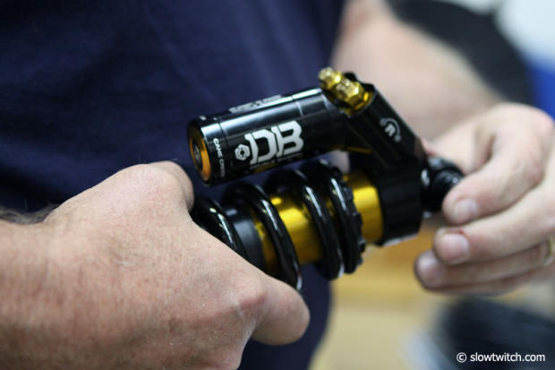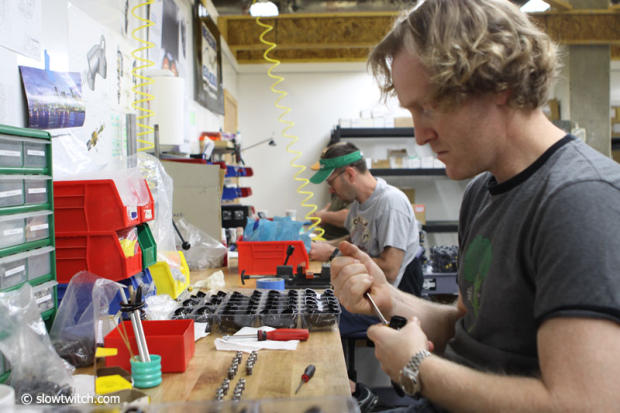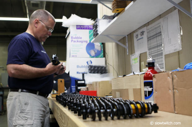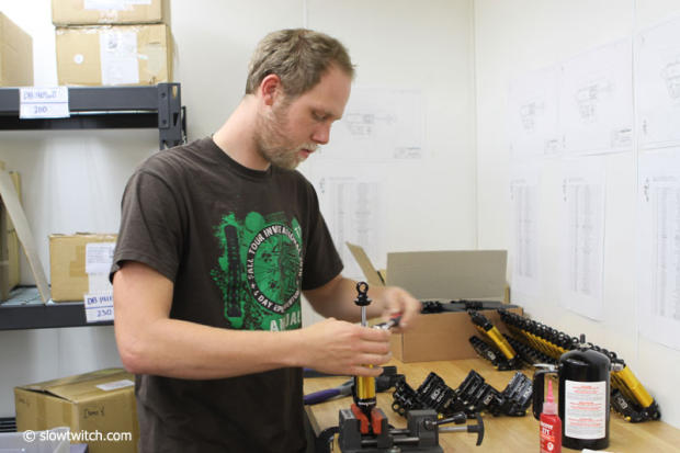 The Double Barrel shock assembly process keeps several guys busy, including John Fennell.