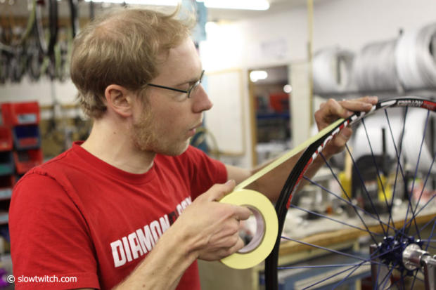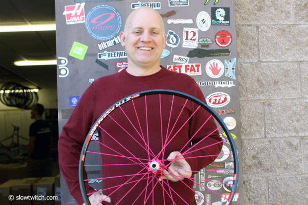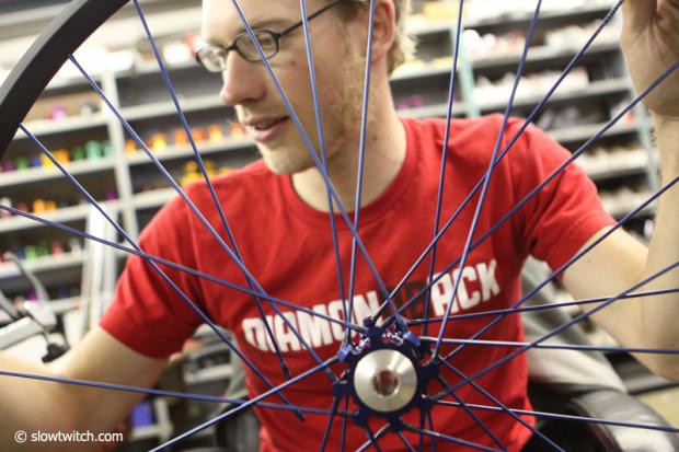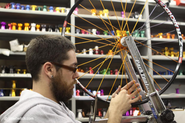 With a color full background of hubs and spokes nearby, Ted Quevedo trues up a wheel with great focus.