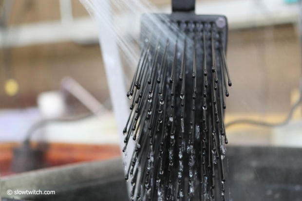 A set of black spokes get rinsed off early in the anodizing process by Drew Hager, the man in charge of that effort.