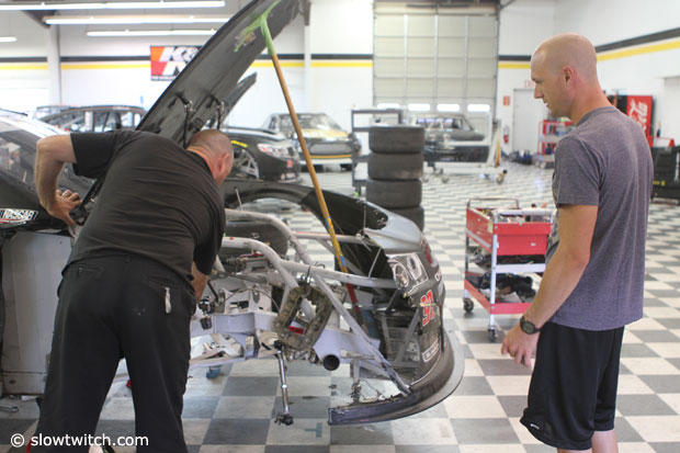 One of the crew members points out the fairly substantial damage the car sustained in last weekend's crash.