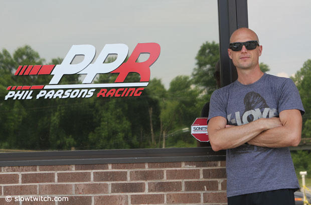 Josh Wise in front of the Phil Parsons Racing shop, the team he races for.