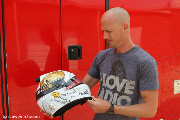 Here Josh Wise is with the fan designed Dogecoin / Reddit car.