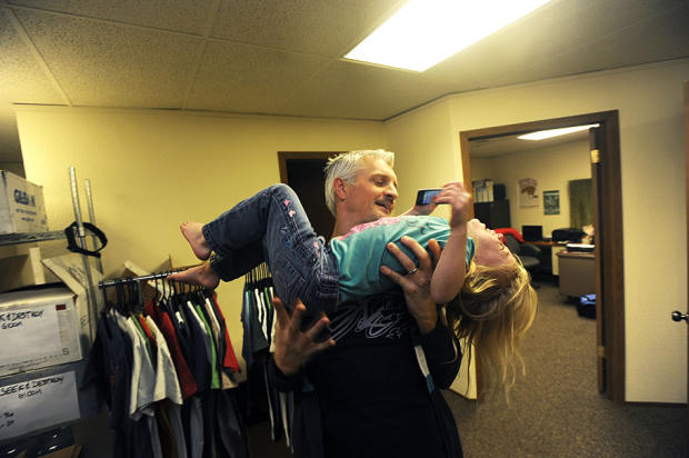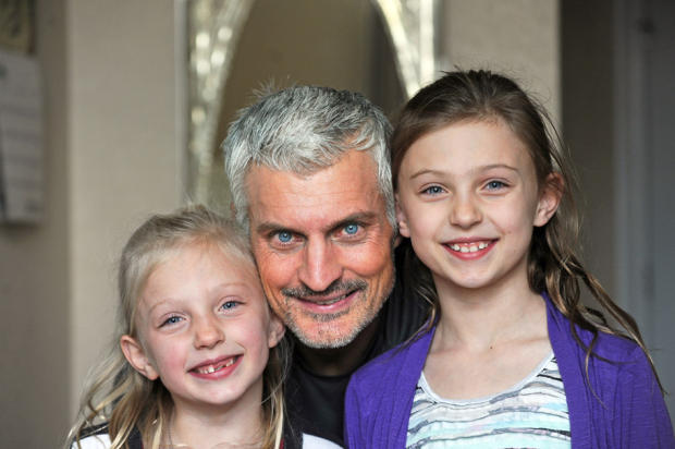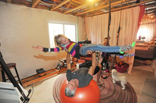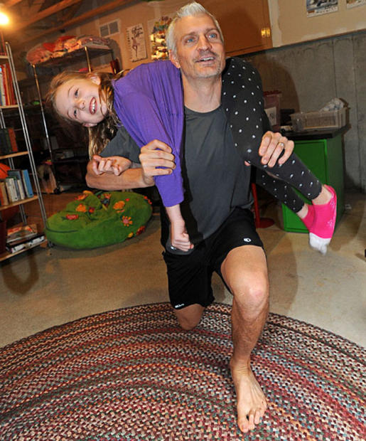 Tony’s children – in this case Summer – delight in serving as weights during his late afternoon workout in the family basement.