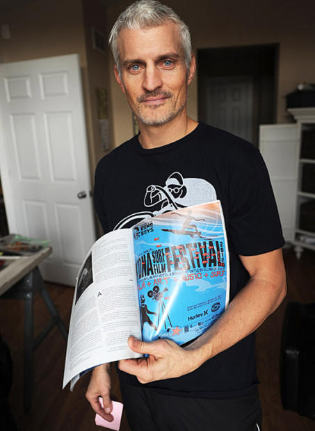 Tony displays his ad for the Kona Surf Film festival.