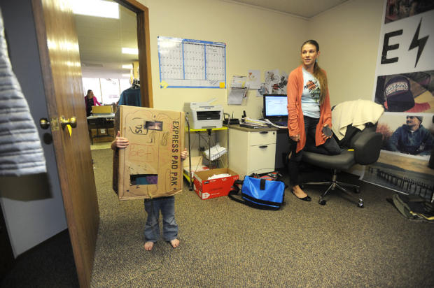Youngest daughter Juniper makes a robot outfit out of one of the EC T-shirt boxes.