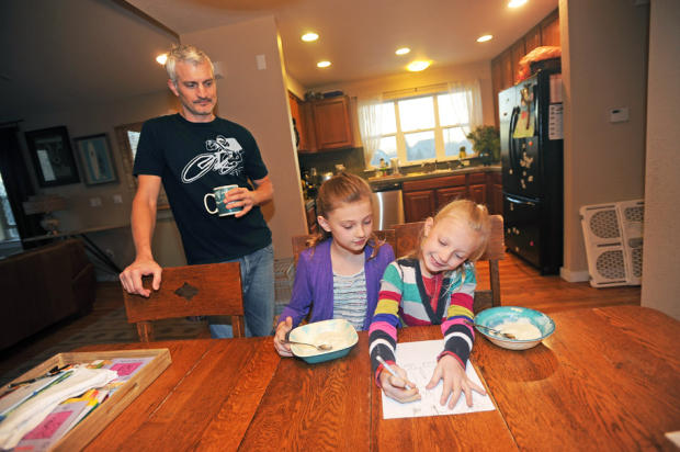 Tony’s daughter Poet draws on the kitchen table before school as Tony and Summer look on.