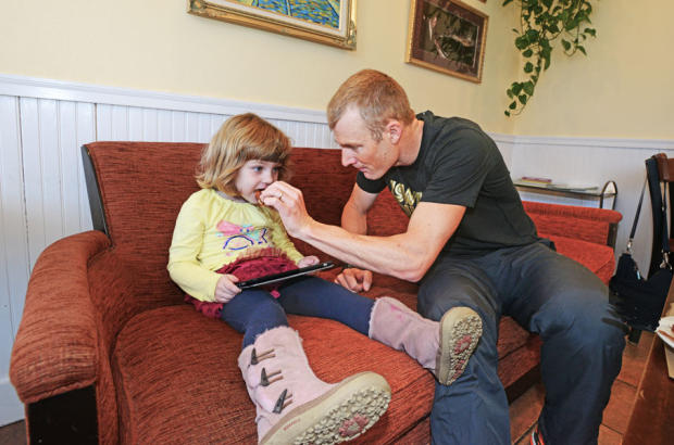 Tyler feeds Savana a bite of some banana bread at Spruce Confections during a stop for coffee on the way to her pre-school.