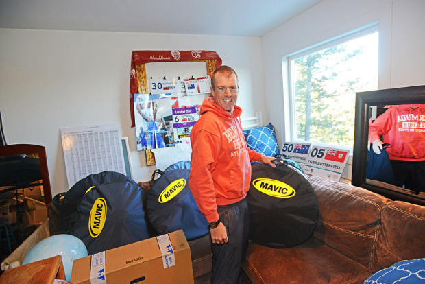 Tyler stores lots of Mavic wheels and several souvenir race numbers in the basement.