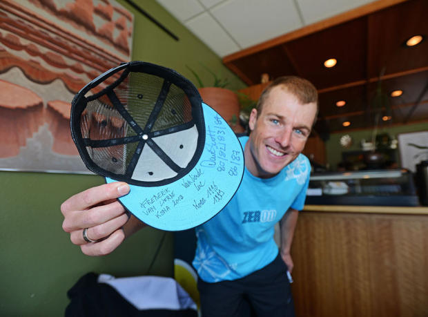 Tyler shows off a cap signed by three Ironman World Champions – six-time champion Dave Scott, current champion Frederik Van Lierde and his coach, two-time Kona champion Luc van Lierde.