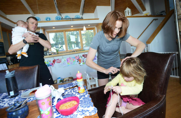 Zero hour draws near so Tyler holds Walker while Nikki brushes Savana’s hair a few minutes before departure for pre-school.