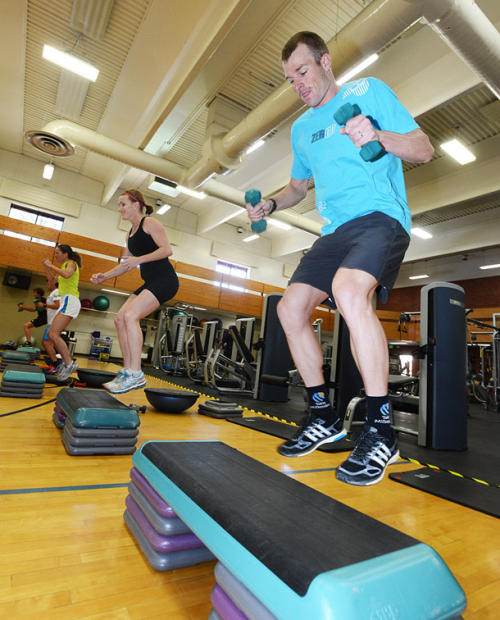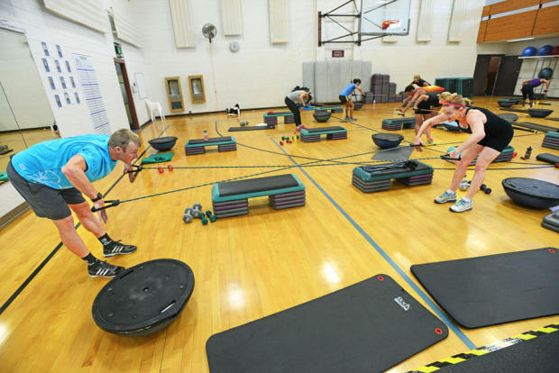 Tyler and Nikki jump with hand weights during a core strength workout led by Dave Scott at Flatiron Athletic Club.