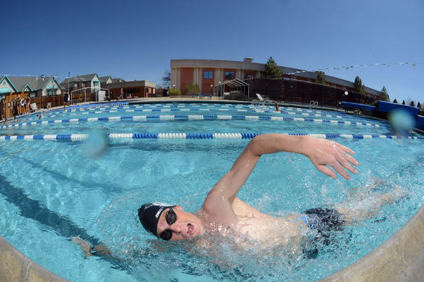 Tyler is not focusing on proper form during a cool down after a tough swim session at the Flatiron Athletic Club pool.