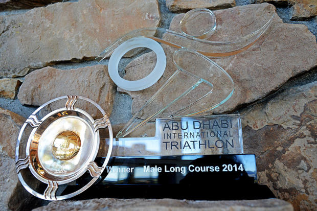Tyler’s 2014 and Nikki’s 2012 Abu Dhabi trophies nestle together at their home in Boulder. The swooping plastic and Plexiglas design is Tyler’s and the bright reflective metal disc is Nikki’s.