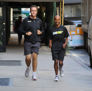 Meb: I’m here in New York to help my friend Jared, from SUBWAY, train for the ING New York City Marathon. It is a bit early to be in the Big Apple, but I am here for a great cause. Jared has been a great inspiration for many, including myself, and I also want to encourage people to make healthy decisions.