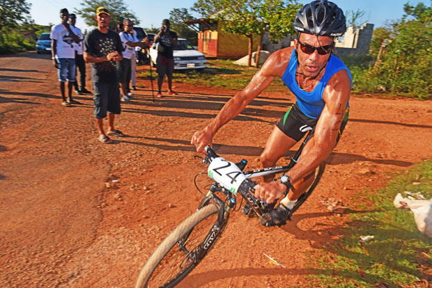 While Ina Daley won this race last year, this time she ran into trouble as her chain came off while dueling with Laura Cousineau of Montreal near there Big Groun hill. First time triathlete Emily Smith, a world class Ultimate Frisbee player from Montana who lives in Montego Bay, used her mountain biking skills to establish an unassailable lead and held on for the win in a time of 1 hour 38 minutes and roughly 20 seconds.