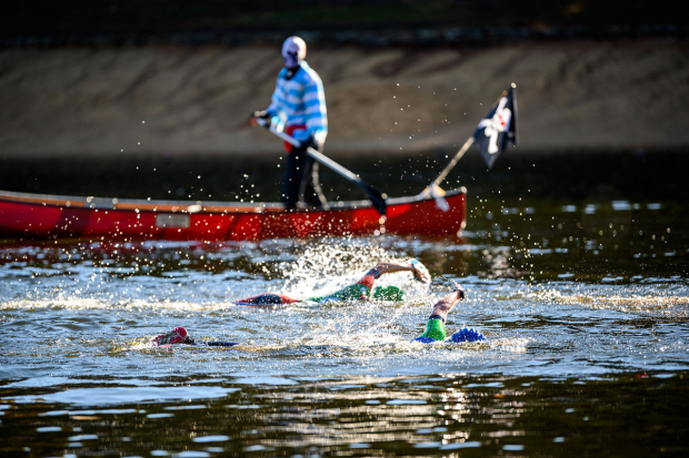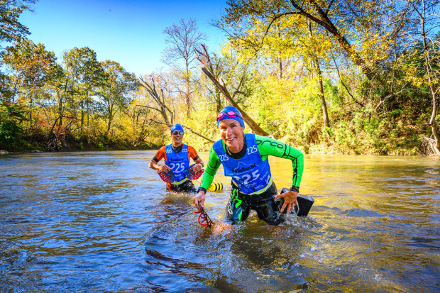 Depending on water levels in the river, some sections can be tackled on foot, but it is usually best to swim. Jennifer Smith and Terri Bosnick are close to the end of the swim and the end of the race.