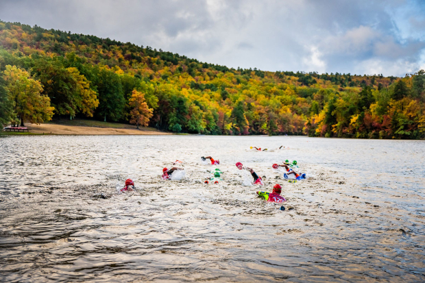 After a 500 meter swim, athletes run on a trail along the bank of the lake before diving back into the water for another short swim. NJ natives Scott Sobkowicz and Paul Zakhour in action.