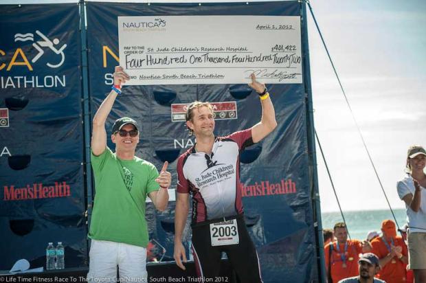 Javier Gomez and Sarah Haskins took the wins at the 2012 Nautica South Beach Triathlon and while they walked away with nice winner checks and an early lead in the Race To The Toyota Cup, a really big check ended up in the hands of the St. Jude Children's Research Hospital.