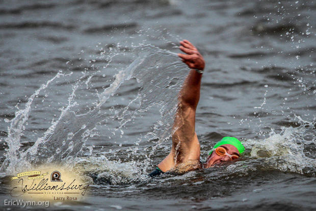 The elite men dash and splash into the water in Williamsburg.