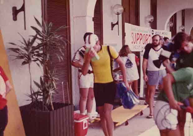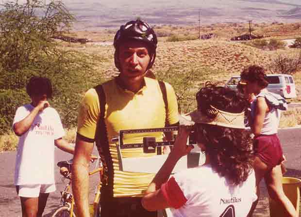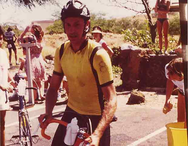 About that course. What you see here is me riding into the weigh station. You might know this, or not, but in 1981 the race was still a medical unknown. Nobody had ever heard of hyponatremia or SIPE and they didn’t know what constituted medical “trouble.” When was the athlete at his or her limit? They decided the metric was weight. If any competitor lost 10 percent of his or her weight at any time during the race, that would result in a medical DNF. We were weighed pre-race, Thursday I think, and they weighed us 5 times during the race (according to memory). Somebody with a clipboard was at each weigh station with the pre-race weights of 326 athletes. We were weighed at the bike turnaround at Hawi, and here in these images at Hapuna Beach, 70 miles into the ride. Then at the bike finish and at 18 miles into the run. That leaves one more weigh station and I don’t remember where that was. I believe this was the only year, before or since, of the weigh stations.