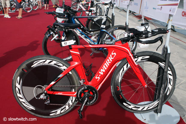 Athletes had time from 9:30 am until 5 pm to check in their bikes and with three separate events running parallel, the transition filled up with a fairly eclectic mix of bicycles. We though focused mostly on a few Pro bikes.