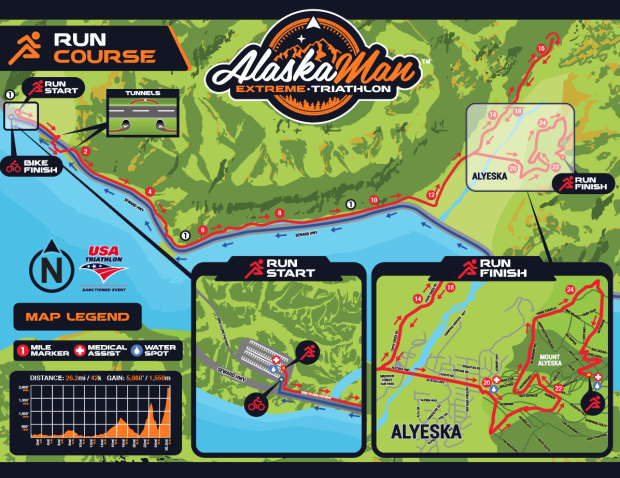 The run course takes athletes along the highway from Girdwood to the base of Mt. Aleyska and then up it to the summit. You do get a mandatory gondola ride down (with your pacer, also mandatory for the last 10km).