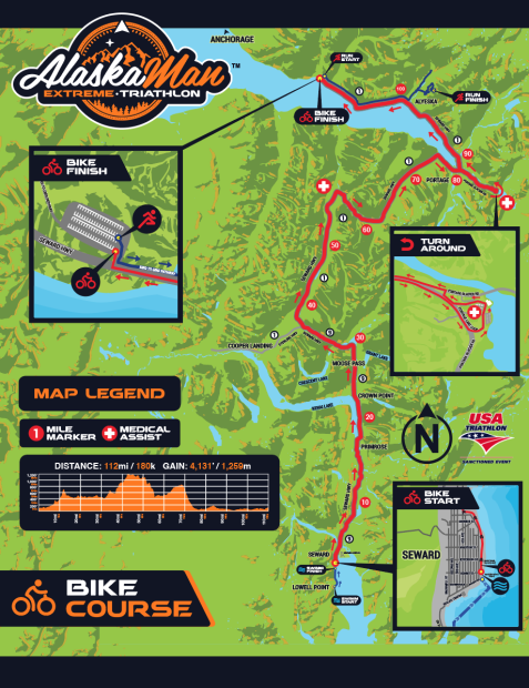 The bike runs from Seward along Seward Highway West almost to Girdwood. Most of the elevation comes in the first half, with the biggest climb coming around 50mi and then another solid climb at about 60mi. The last 40mi or so are pretty flat. Athletes must provide their own SAG support. There are medical checkpoints on course, but no aid stations in the traditional sense.