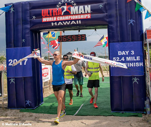 Jeremy Howard, 37, lives in Fredericksburg, Virginia and works as an endurance sports coach. In 2015, he made the podium at Ultraman Hawaii after an injury severely limited his training. “I had knots deep in my lower abs and it felt like my muscles were ripping off my groin,” said Howard. “Physical therapists and doctors looked for hernias and torn hip flexors but they couldn’t figure it out. So I took off two and a half months. After that, I did massive swim and bike volume and occasionally did a 15 minute jog. Someone suggested rolling out my lower abs with a lacrosse ball. After a couple weeks, a 20 minute jog started feeling OK. I knew I could do two days at Ultraman – then see about the run.” Howard finished with a 6:49 double marathon, eager to realize his Ultraman potential.